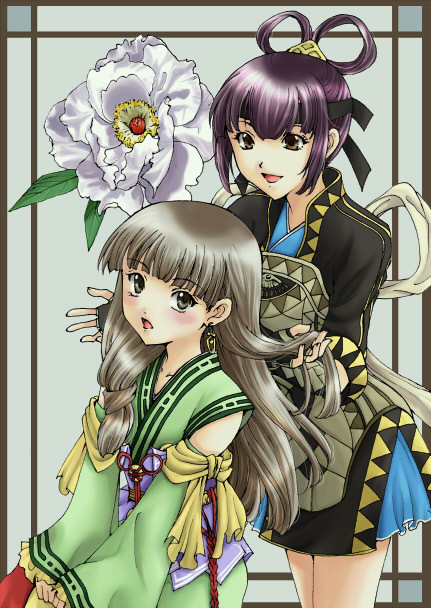 armorblushbrown eyesbrown hairdressfingerless glovesflowergloveslong hairminiskirtpurple eyespurple hairshort hairskirt