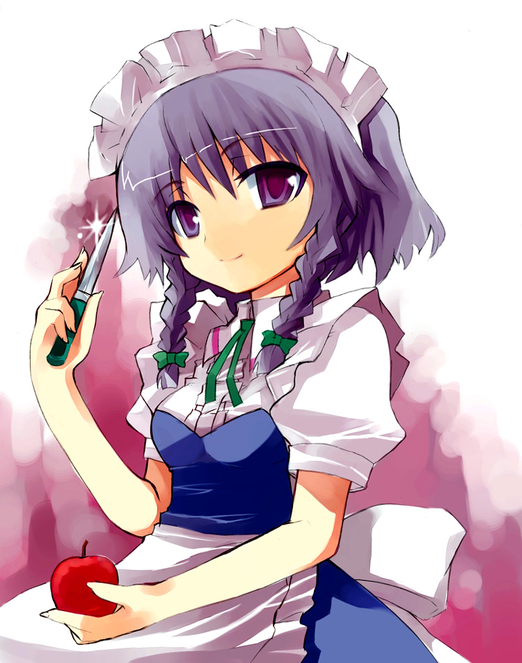 1girlapplebowbraidbreastsfemale focusfoodfruitgradient backgroundhair ribbonknifemaidpurple eyespurple hairribbonsolotwin braidswhite background