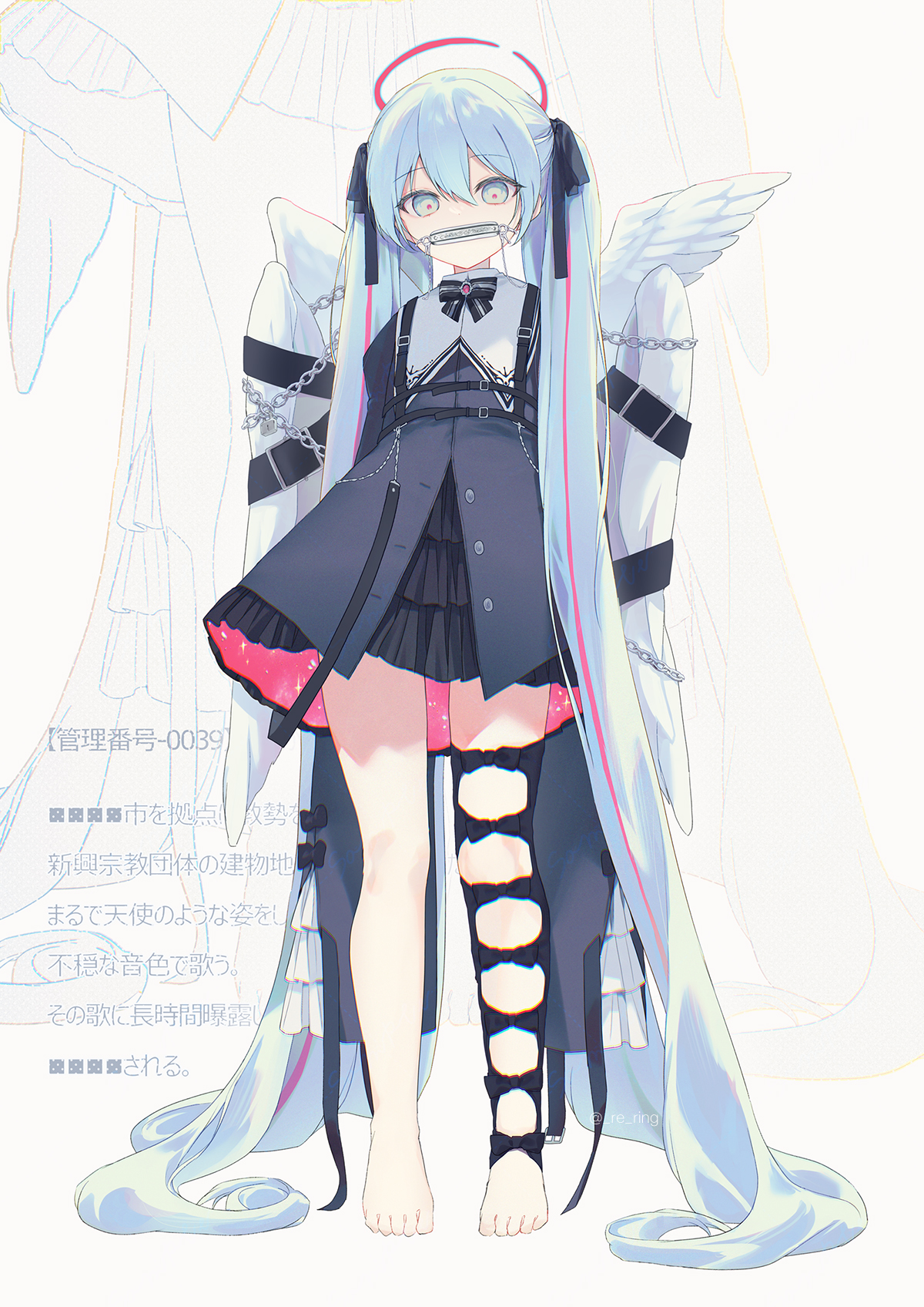 1girlbarefootblack bowblack dressblack thighhighsblue hairbowchaindressfeathered wingsfull bodygrey backgroundgrey eyeshair between eyeshair bowhalolong hairmulticolored hairno shoespink hairsimple backgroundsingle thighhighsolostandingstreaked hairstriped bowthighhighstwintailsvery long hairwhite wingswings