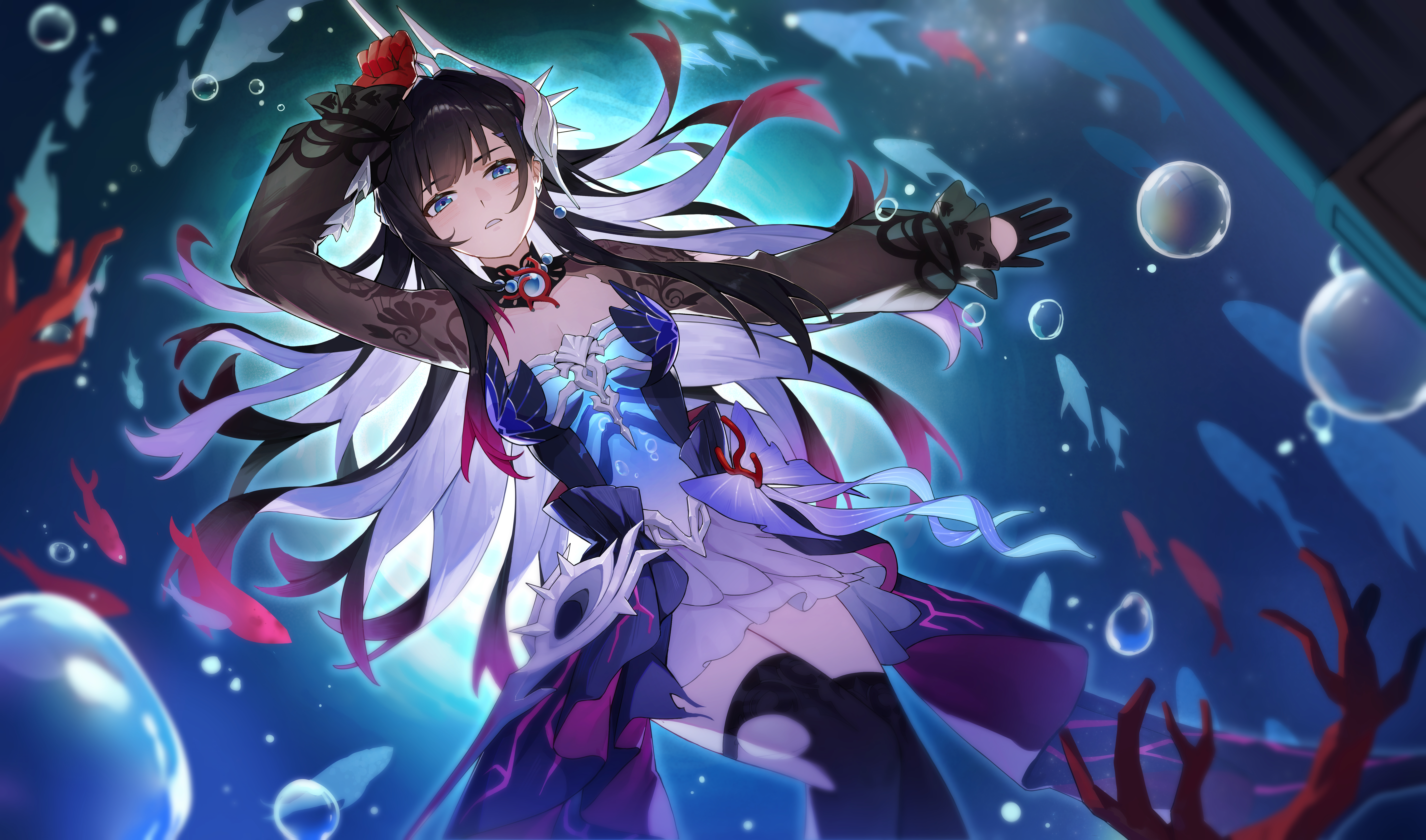 1girlblack dressblack glovesblack hairblue eyesblushbreastscleavagedressfishgloveshair between eyeshair ornamentjewelrylong hairlong sleeveslooking at viewermedium breastsnecklaceparted lipspearl necklacepurple hairsolounderwater