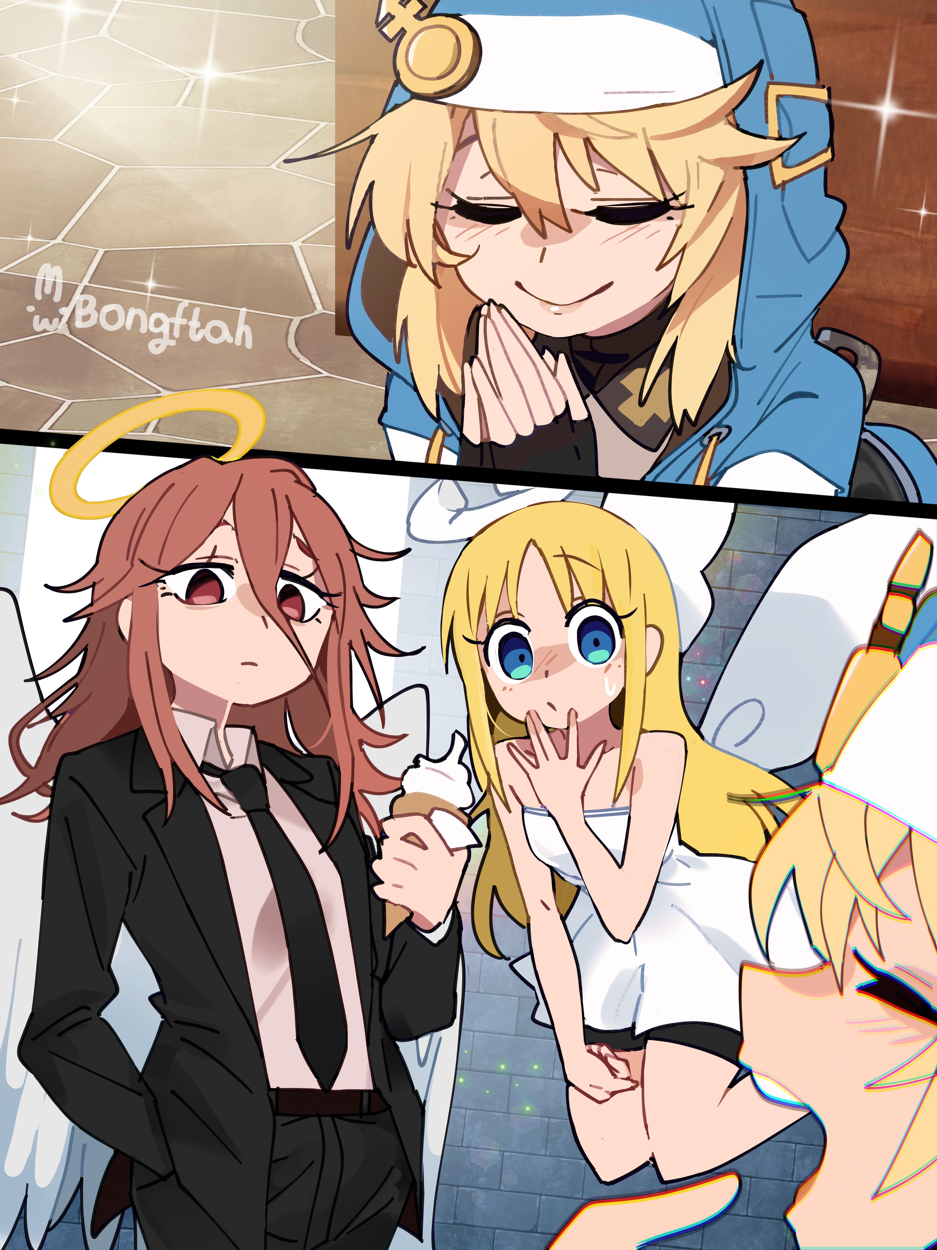1girl2boysangelangel wingsblack glovesblack necktieblonde hairblue eyesdressfingerless glovesflyingfoodformal clothesgloveshaloholdingholding foodholding ice creamice creamlong hairlong sleevesmolemole under eyemultiple boysnecktienunopen mouthown hands togetherprayingred eyesred hairsmilesuitwhite dresswhite halowhite wingswingsyellow halo