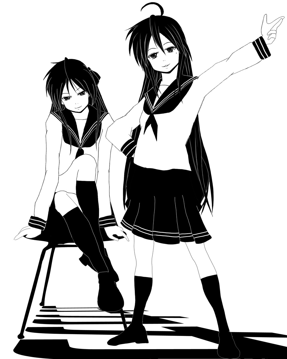00s2girlsahogegreyscalehigh contrastmolemole under eyemonochromemultiple girlsschool uniformserafukusittingsocksstanding