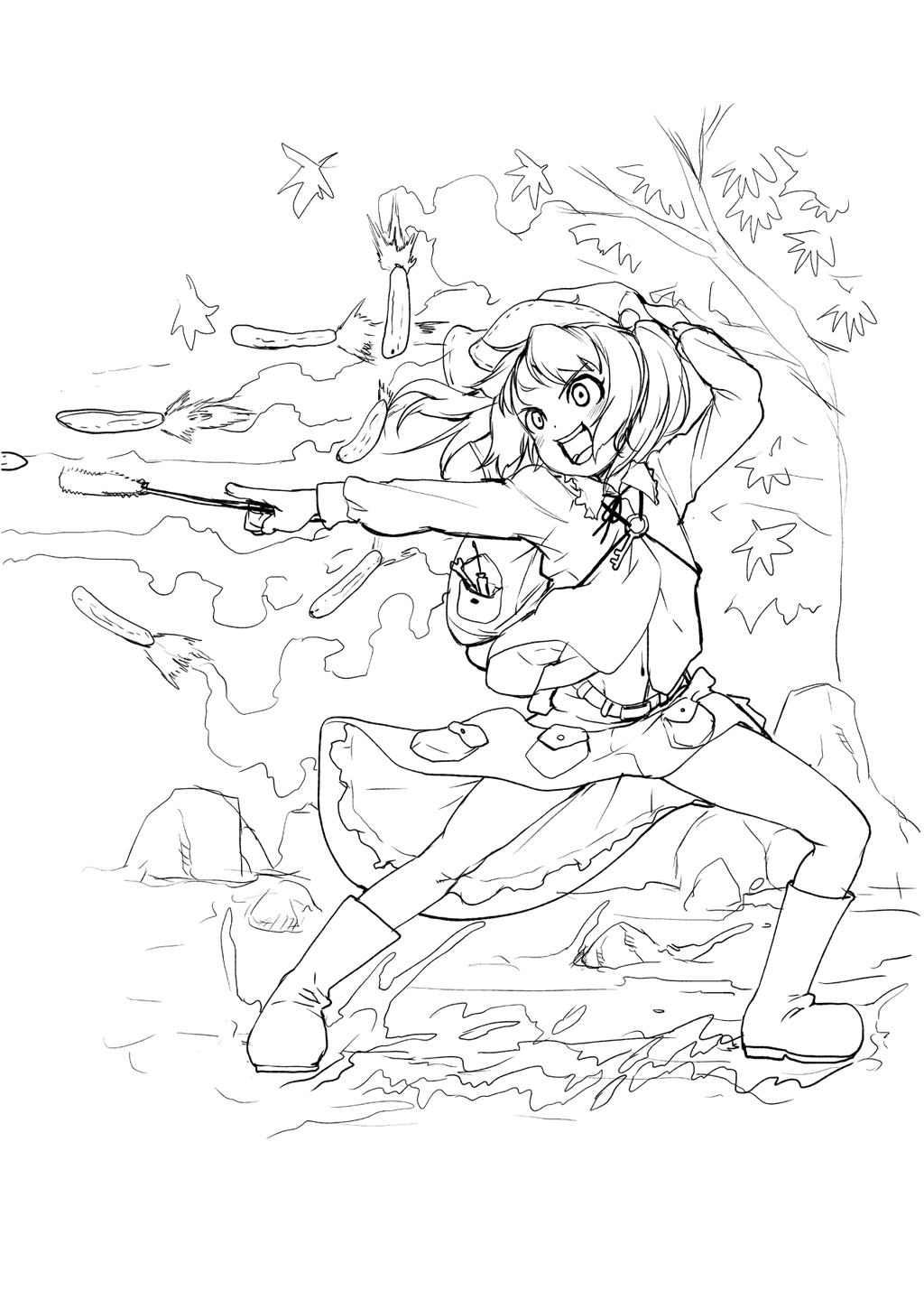 seo tatsuya, original, absurdres, highres, traditional media, 1girl, animal ear fluff, animal ears, breasts, breasts out, censored, clothes down, cowboy shot, dated, fox ears, fox girl, japanese clothes, kimono, large breasts, long hair, looking at viewer, monochrome, novelty censor, open clothes, open kimono, open mouth, ponytail, puff of air, ruler, sidelocks, smile, solo, twitter username