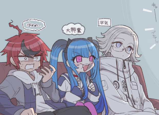 piutahayo, hatsune miku, kasane teto, utau, vocaloid, absurdres, highres, 2boys, 2girls, aqua eyes, aqua hair, aqua trim, asymmetrical docking, black boots, black skirt, black thighhighs, boots, bottomless, breast press, breasts, clothed female nude male, colored shoe soles, english text, erection, gluteal fold, grabbing another's leg, hetero, leg up, miniskirt, multiple boys, multiple girls, navel, nipples, no panties, nude, penis, pussy, pussy juice, red eyes, red hair, sex, shiny skin, skirt, small breasts, speech bubble, spread legs, standing, standing on one leg, standing sex, stomach, thighhighs, thighs, uncensored, vaginal