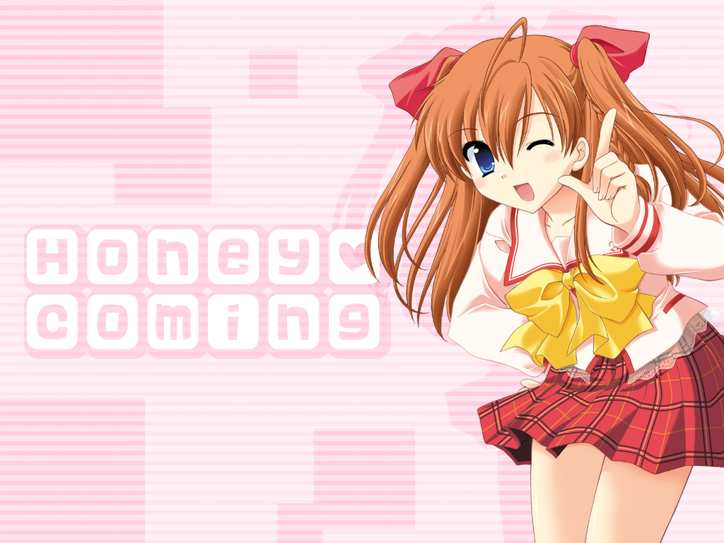 :d1girlahogeblue eyesblushbowbraidbrown hairfemale focushand on own hiphip focusindex finger raisedone eye closedopen mouthorange hairplaid clothesplaid skirtpleated skirtschool uniformserafukuside braidskirtsmilesolotwintailswink