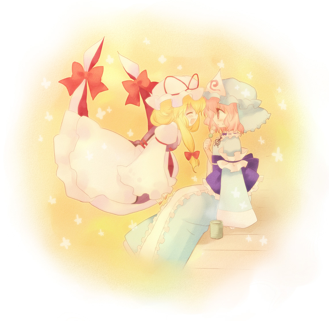 2girlsblonde haircupdangoeatingfemale focusfoodgap (touhou)hair ribbonhathat ribbonjapanese clotheskimonolong hairmultiple girlspink eyespink hairribbonsanshoku dangoshort hairskewersmilewagashiyunomi