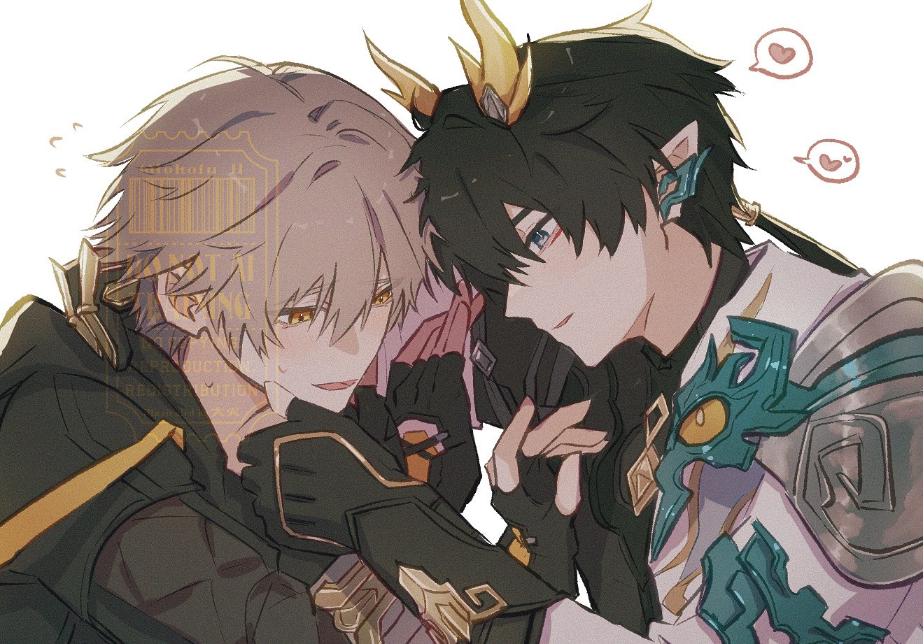 2boysarmorbarcodeblack coatblack glovesblack hairblack shirtchinese clothescoatdragon boydragon hornsearclipeyelinerfingerless glovesflying sweatdropsgauntletsglovesgreen eyesgrey hairhair between eyeshair ornamenthalf-closed eyeshand on another's chinhand on another's neckhearthoodhooded coathornslong hairlong sleeveslooking at anotherlow ponytailmakeupmale focusmultiple boysofficial alternate costumeofficial alternate hairstyleopen mouthpointy earsponytailred eyelinershirtshort hairshoulder armorsimple backgroundsmilespeech bubblespoken heartsweatupper bodywatermarkwhite backgroundwhite coatyaoiyellow eyes
