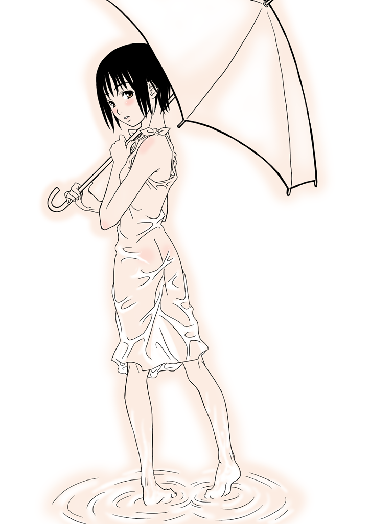 1girlassbackbare shouldersbarefootblack hairblushbrown eyesfeetfemale focuslooking backmonochromepink themesee-through clothessepiashort hairsolospot colorumbrellawetwet clothes
