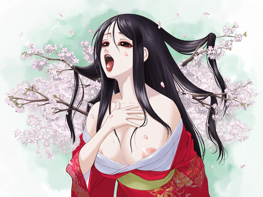1girlareola slipbare shouldersblack hairbreastscherry blossomsfemale focusjapanese clotheskimonolarge breastslong hairoff shoulderpetalssolotongue