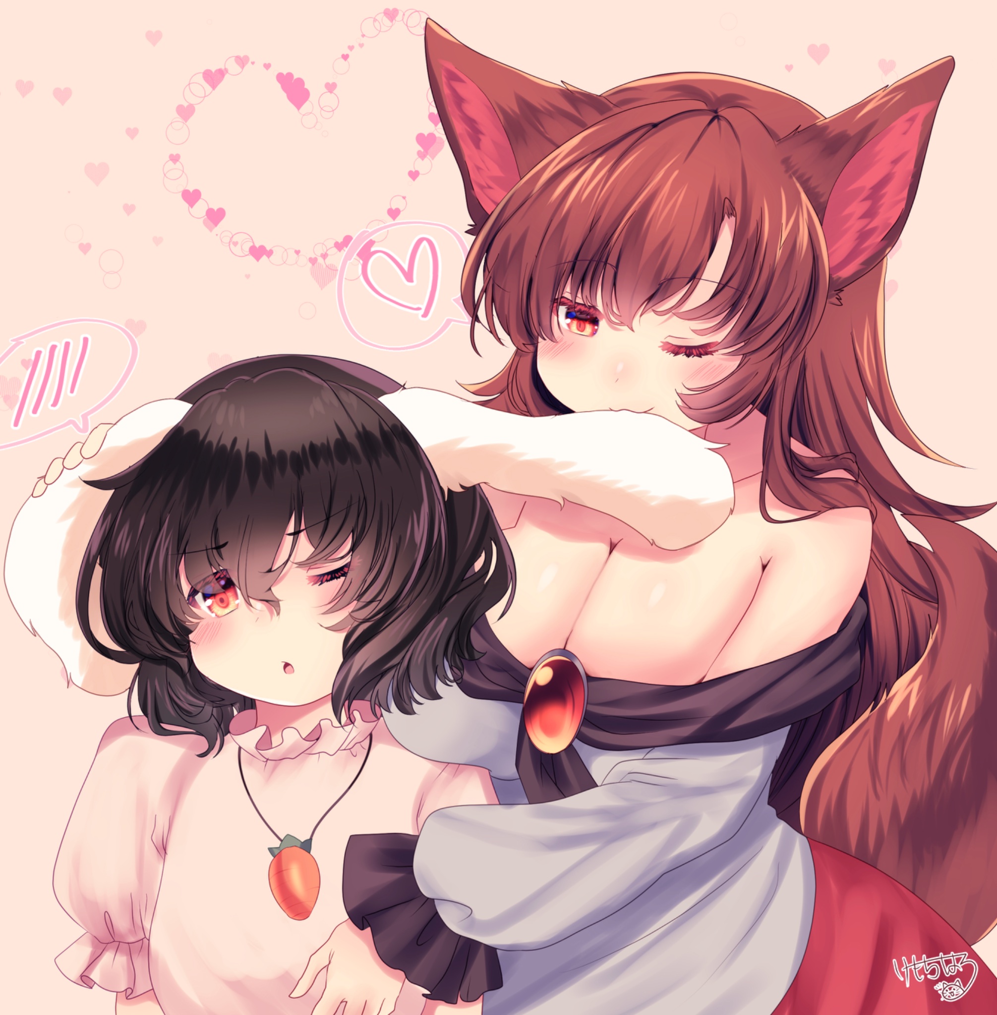 :o1boy2girlsanimal earsbitingblack hairbreastscarrot necklacecleavagedressfangfloppy earshand on another's headheartjewelrylarge breastsmultiple girlsnecklaceone eye closedpink backgroundrabbit earsrabbit girlred dressred eyesshort hairsignaturesimple backgroundspoken ellipsisspoken hearttwo-tone dressupper bodywhite dress