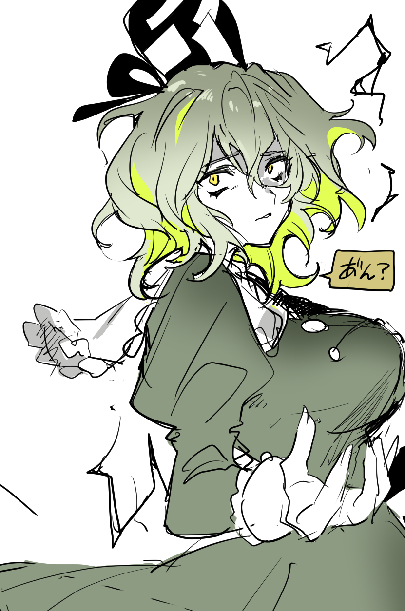1girlblack hatbreastsdressfrom sidegreen dressgreen hairhatjuliet sleeveslarge breastslightninglong sleeveslooking at viewerparted lipspuffy sleevesshort hairsimple backgroundsolospeech bubbletate eboshiupper bodywhite backgroundyellow eyeszaqo daaken573