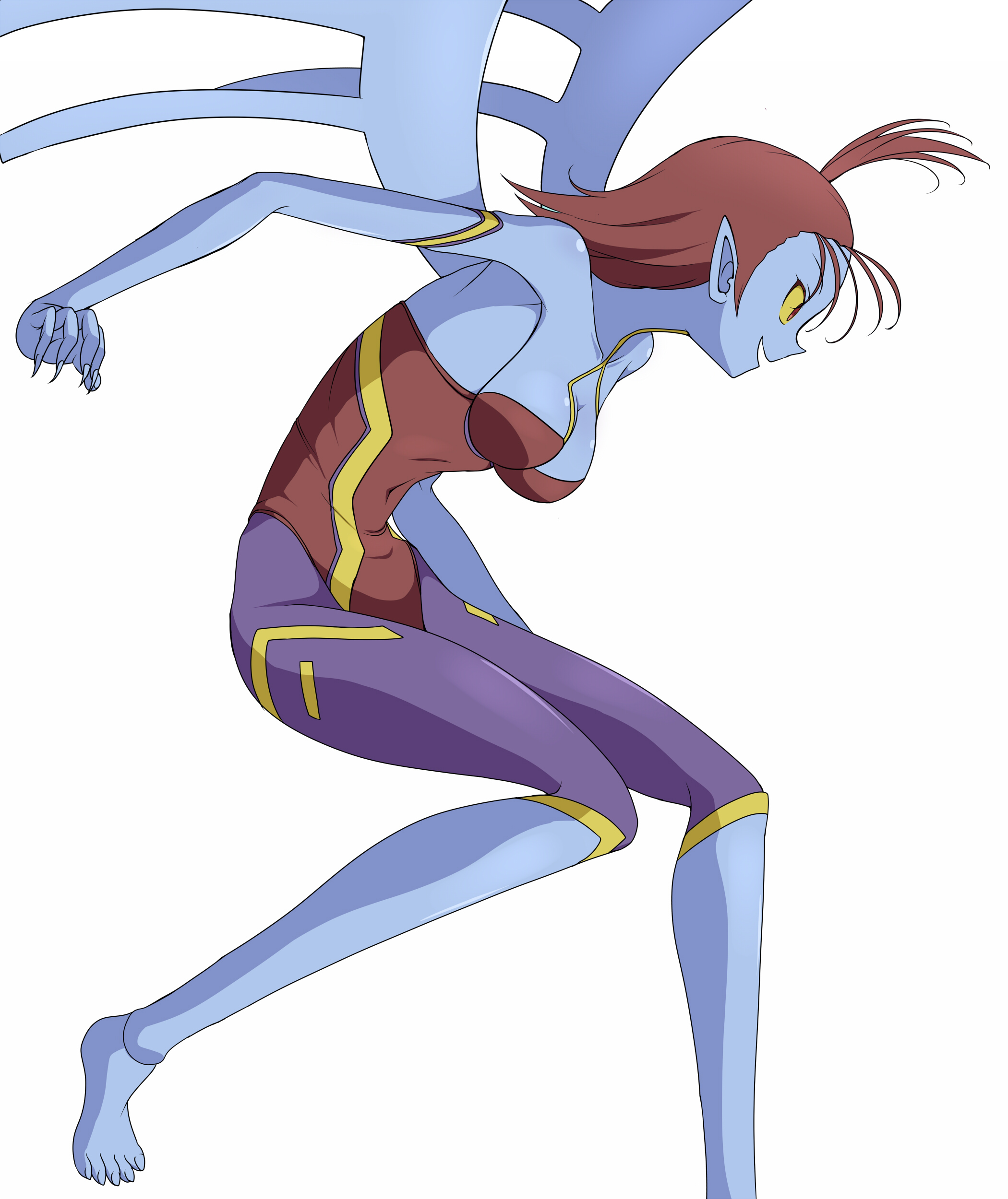 1girlbreastscolored scleramonster girlpixiv user (144259)pointy earssimple backgroundwhite backgroundwingsyellow sclera
