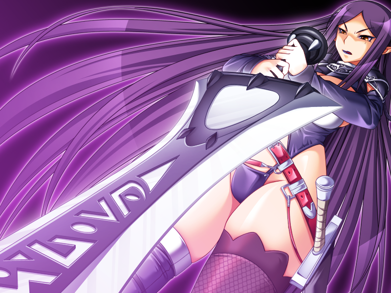 1girlelffemale focuslipsticklong hairmakeuporange eyespointy earspurple hairsoloswordthighhighsvery long hairweapon