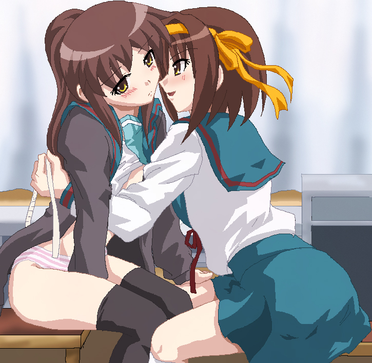 00s2girlscardigangenderswapgenderswap (mtf)multiple girlsno pantsoekakipantiesponytailschool uniformserafukuskirtstriped clothesstriped pantiestape measurethighhighsunderwearyuri