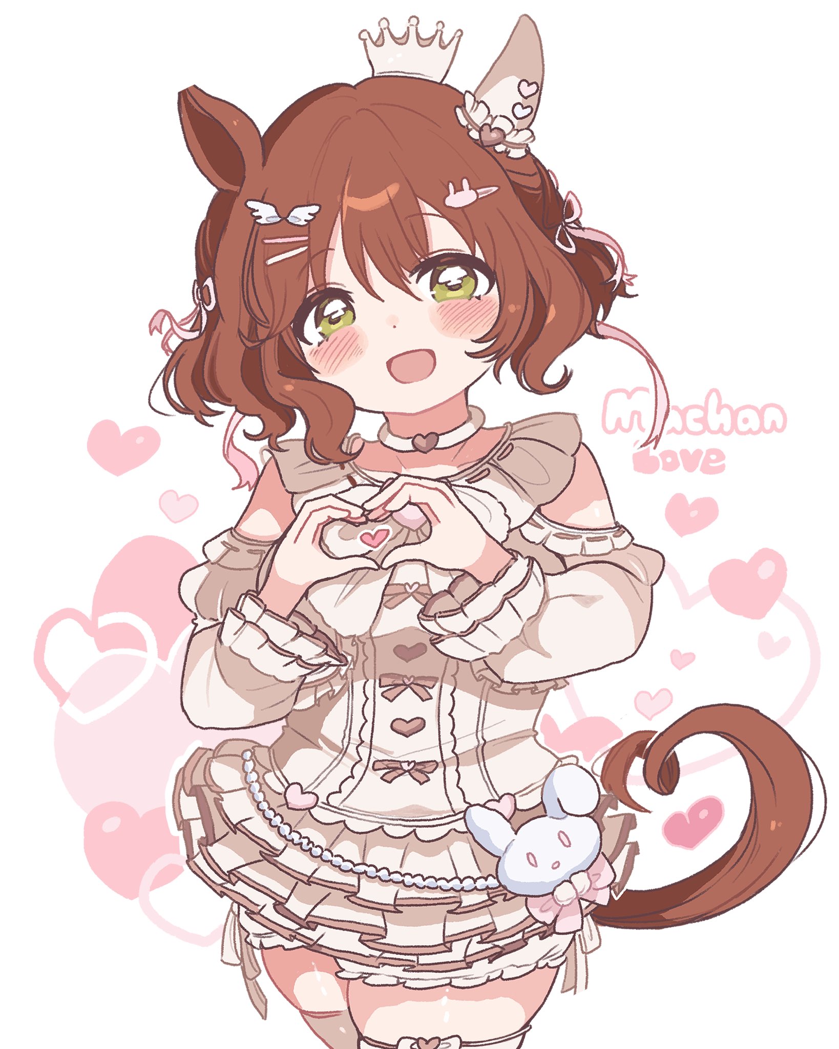 1girlanimal earsblushbowbreastsbrown hairchokerclothing cutoutcrownear coversgreen eyeshair between eyeshair ornamenthair ribbonheartheart handshorse earshorse girlhorse taillong sleeveslooking at viewermedium hairmini crownopen mouthribbonshirtshoulder cutoutsingle ear coverskirtsmilesolotailthighhighsthighswhite chokerwhite shirtwhite skirtwhite thighhighszettai ryouiki