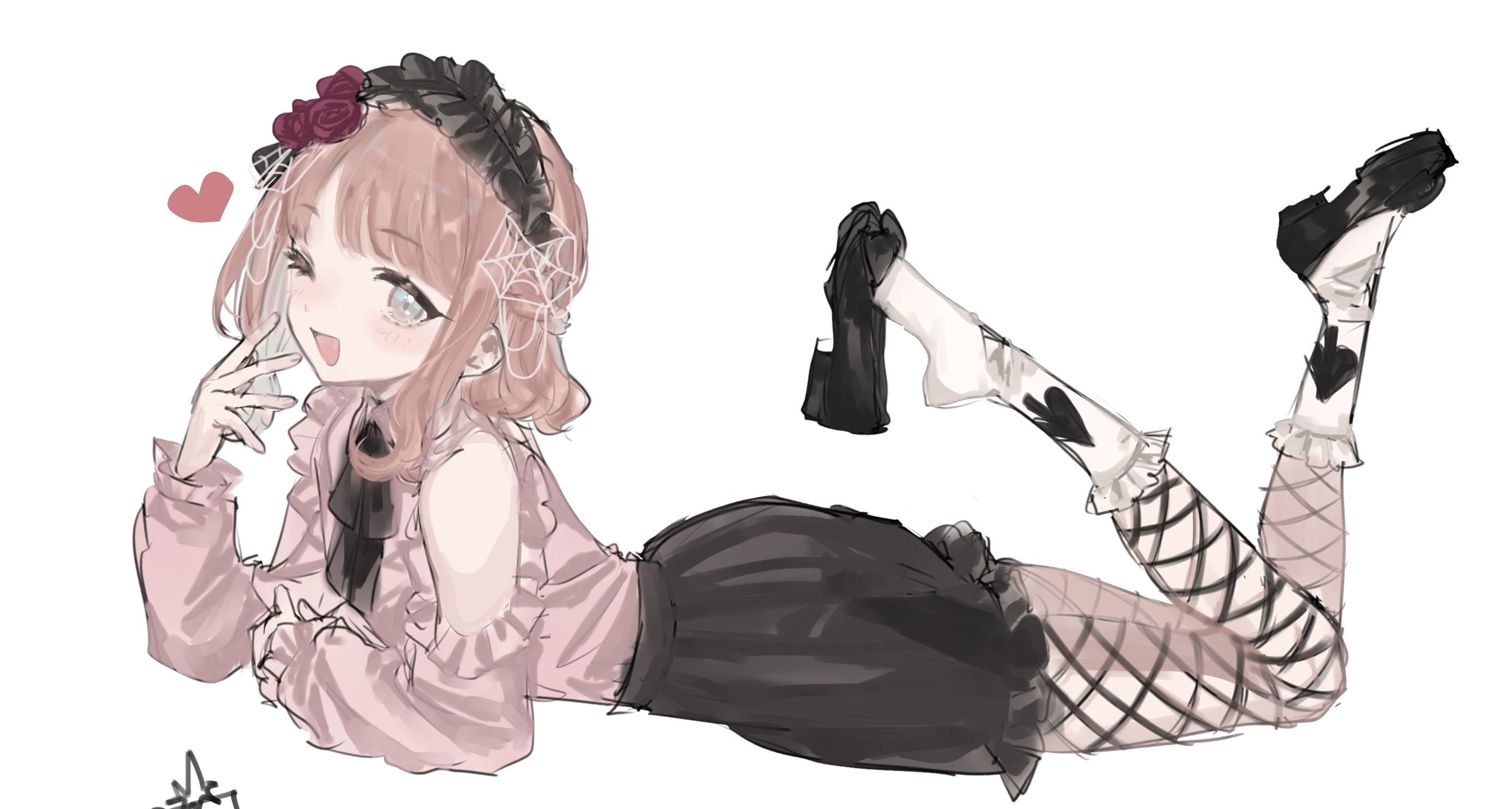 :d1girlbare shouldersblack headdressblack shoesblack skirtblue eyesbrown hairclothing cutoutfeet upfishnet pantyhosefishnetsfull bodyhand upheaddressheartlong sleeveslooking at viewerlyingon stomachone eye closedopen mouthpantyhoseparted bangspink shirtshirtshoe dangleshoesshort hairshoulder cutoutsimple backgroundsketchskirtsmilesockssolowhite backgroundwhite socks