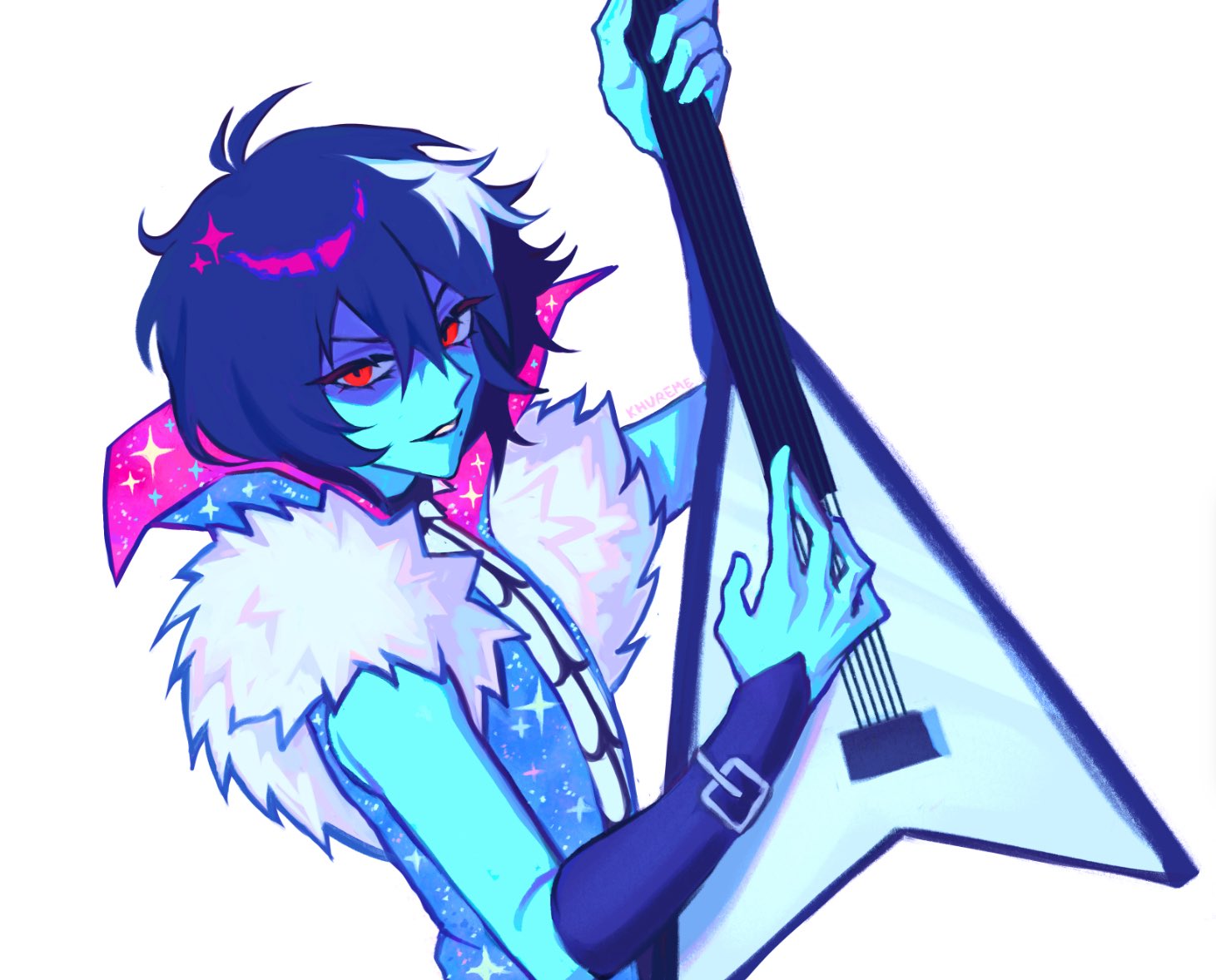 :d1otherantenna hairarm upartist namebare shouldersblue hairblue jacketblue skincolored skindouble-parted bangselectric guitarfingernailsfur trimfur-trimmed jacketgringuitarhair between eyeshand upholdingholding guitarholding instrumentinstrumentjacketkhuremelooking at viewermusicopen mouthother focusplaying guitarplaying instrumentred eyesshirtshort hairsimple backgroundsleevelesssleeveless jacketsleeveless shirtsmilesolosparkletsurimeupper bodyv-shaped eyebrowswhite backgroundwhite shirt