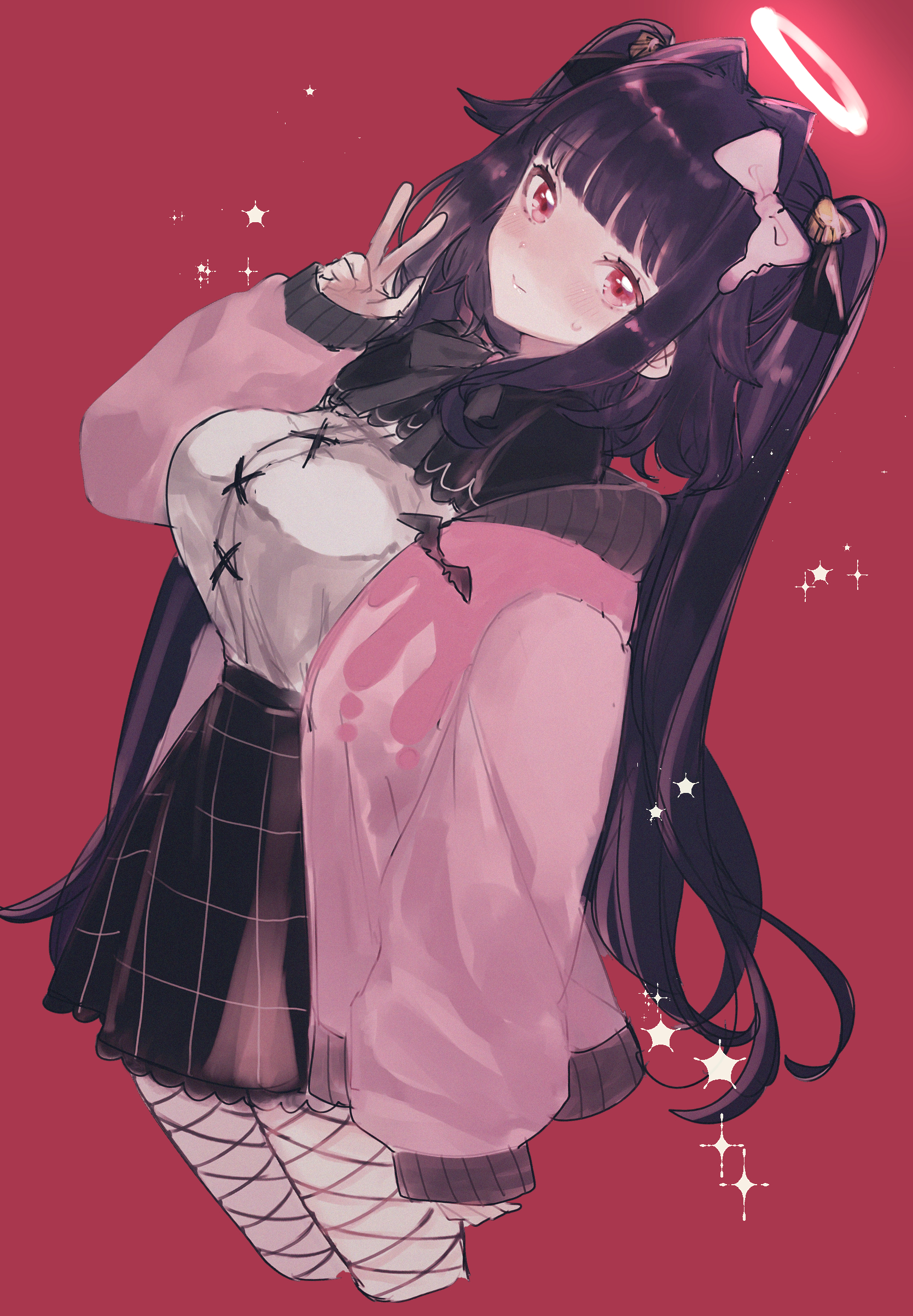 1girlblack skirtblunt bangsblushbowbreastsclosed mouthcropped legsfishnet pantyhosefishnetshair bowhalohand upjacketlarge breastslong hairlong sleeveslooking at viewerminiskirtopen clothesopen jacketpantyhosepink bowpink jacketpurple hairred backgroundred eyesshirtshirt tucked insimple backgroundsketchskirtsleeves past wristssmilesolowwhite halowhite shirt