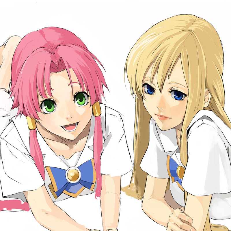 misumi nagisa, yukishiro honoka, futari wa precure, precure, striped neckwear, 00s, 2girls, blue hair, blush, bow, bowtie, brown eyes, brown hair, closed eyes, hair ornament, hairclip, hug, hug from behind, long hair, multiple girls, orange background, orange eyes, orange hair, plaid clothes, plaid skirt, school uniform, serafuku, short hair, skirt, smile, striped bow, striped bowtie, striped clothes, yuri