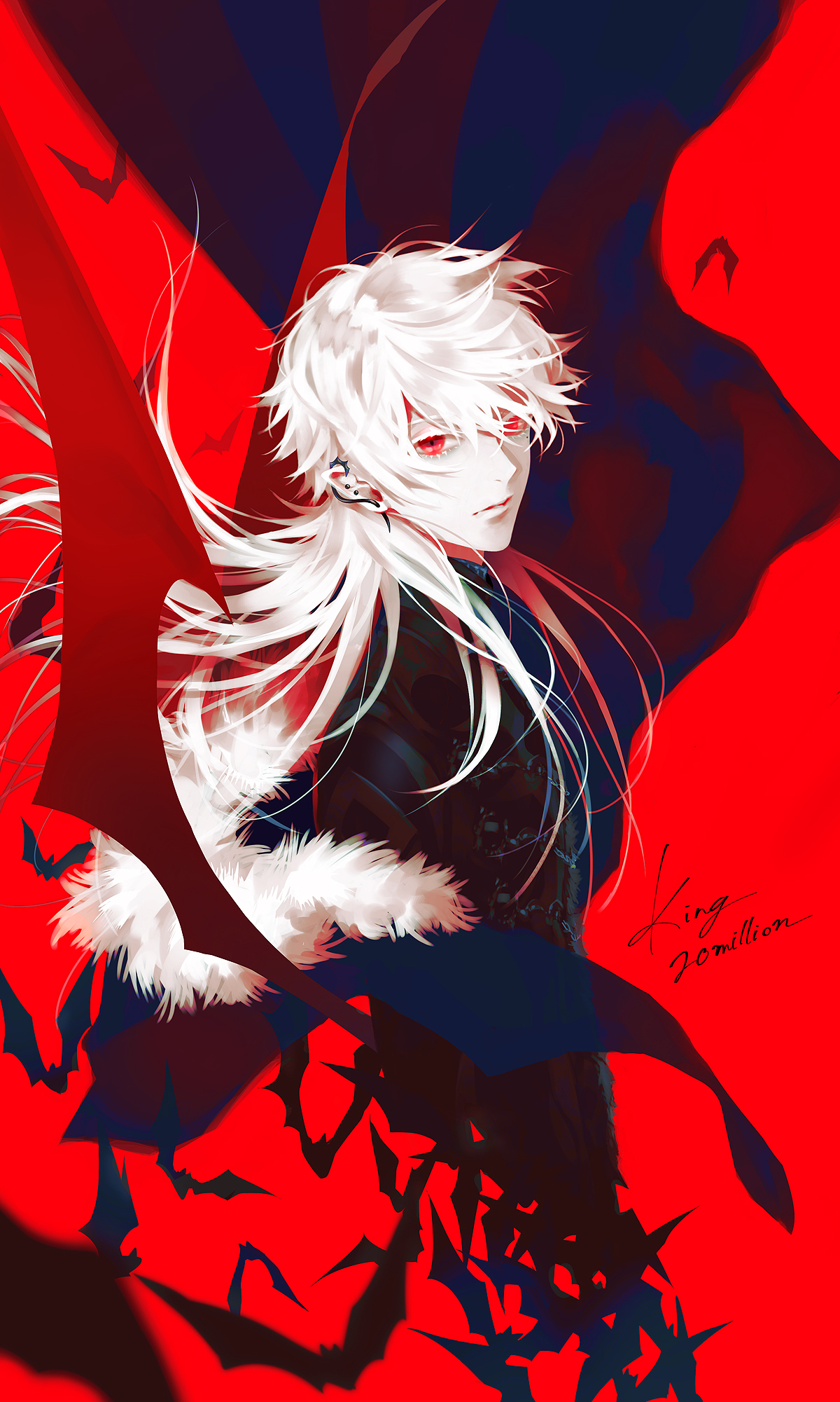 1boybat (animal)bat wingsblack jacketcapeclosed mouthcolored eyelashescrosscross earringsdatedear piercingearringsenglish textfloating clothesfloating hairfur trimfur-trimmed capehair between eyesjacketjewelrylimited palettelong hairlooking at viewermale focusparted lipspiercingpointy earsred backgroundred capered eyesred themered wingssignaturesimple backgroundsolospot colorvampirevirtual youtuberwhite eyelasheswhite hairwings