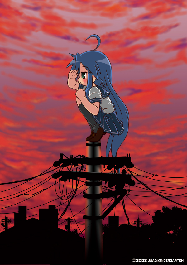 00s1girlahogeblack socksblue haircloudfemale focusfrom sidekneehighslong hairlooking afarmolemole under eyeon top of polepleated skirtpower linesred skyschool uniformserafukuskirtskysockssoloutility pole