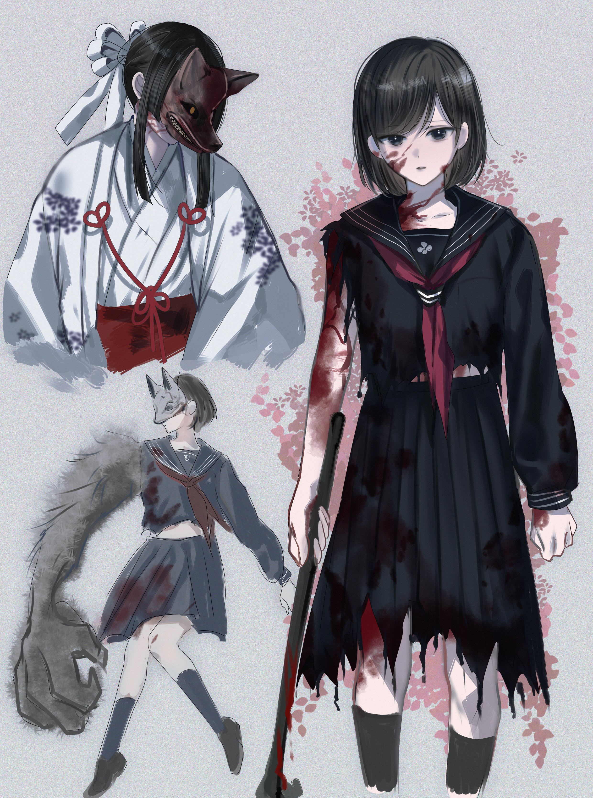 2girlsblack serafukublack skirtblack socksbleedingbloodblood on clothesblood on facefox maskgrey backgroundholdingholding lead pipejapanese clotheslead pipemaskmidriffmismatched armsmultiple girlsneckerchiefred neckerchiefschool uniformserafukuskirtsockstorn clothes