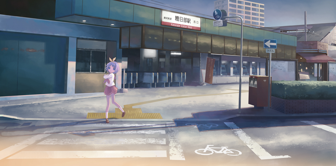 00s1girlblue eyesbuildingcityscapecrosswalkfemale focusin-universe locationoutdoorspurple hairribbonroadschool uniformserafukushort hairsignsolostreettactile pavingtrain station