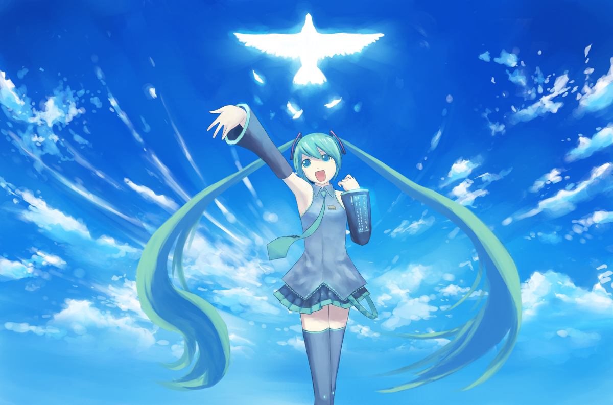blue eyesclouddaydetached sleevesgreen hairlong hairnecktieskirtskythighhighstwintailszettai ryouiki