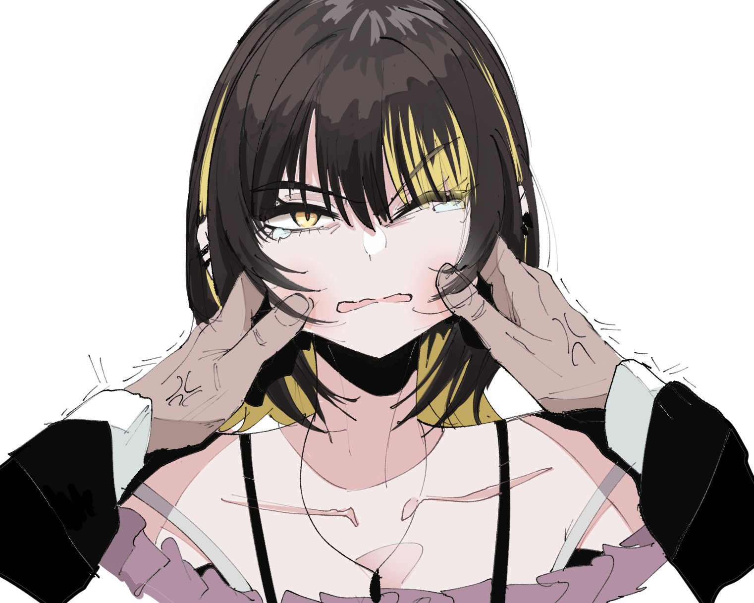 1boy1girlblack hairblonde hairhands on another's facejewelrymulticolored hairnecklacepiercingpinchingpinching cheekrip van winkle (chlwhdgk3)streaked hairtearing uptearsveinsveiny handswhite background