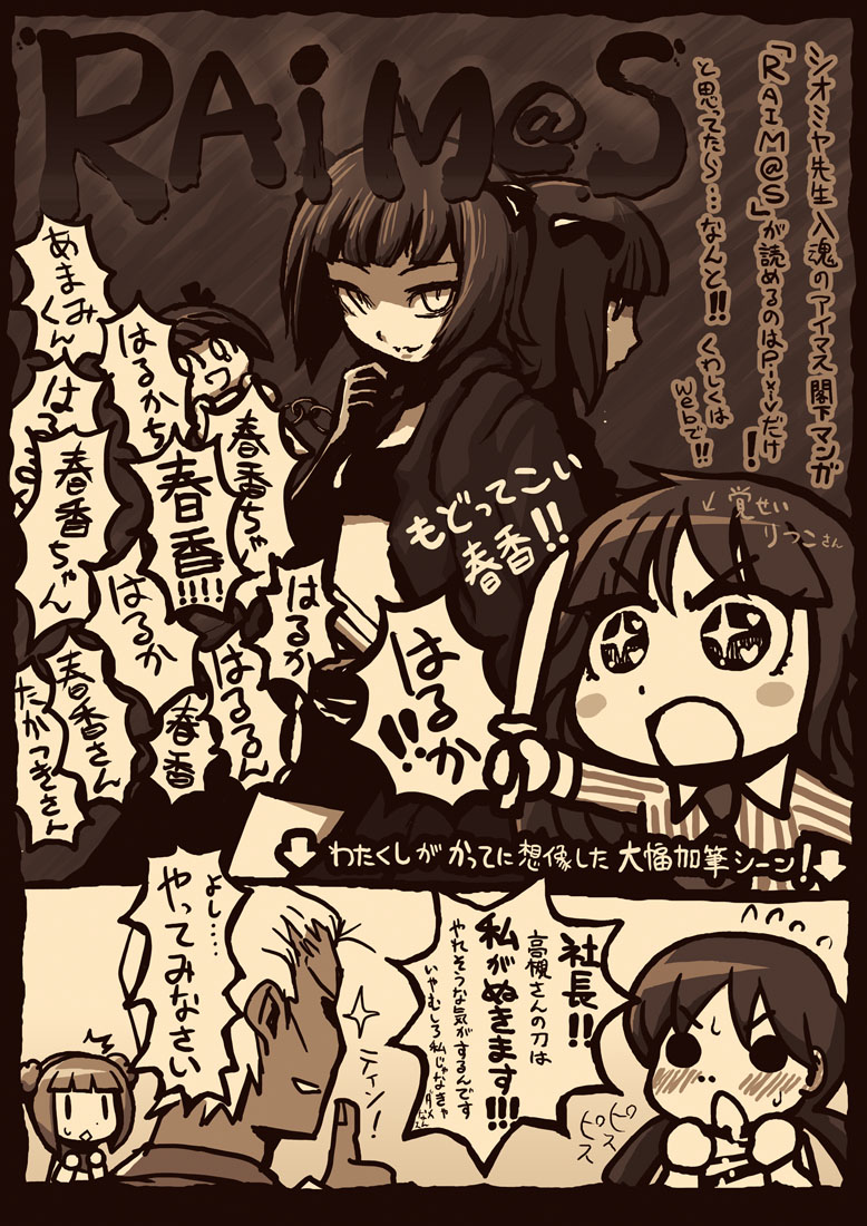 amai yume, kure kirika, mahou shoujo madoka magica, mahou shoujo oriko magica, absurdres, highres, translation request, black coat, black hair, coat, collared shirt, cropped torso, eyepatch, medium hair, necktie, orange eyes, red necktie, shirt, speech bubble, white background, white shirt