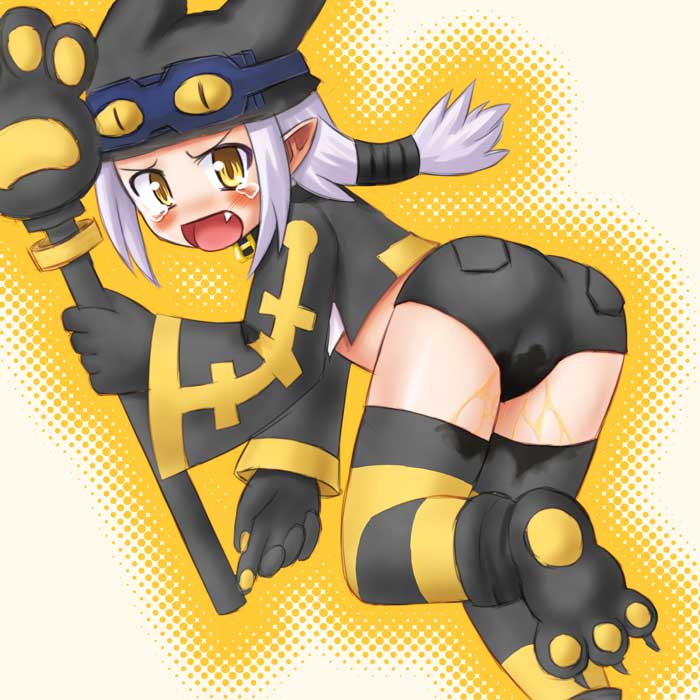 1girlblack shortsblushdemon girlfangfemale focuslong hairpeepeeingpeeing selfshortssolostriped clothesstriped thighhighstearsthighhighsyellow eyes