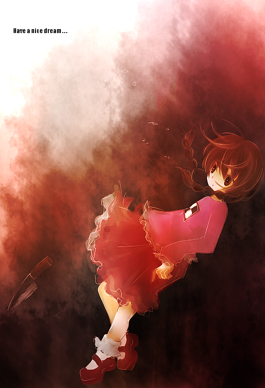 1girlbraidbrown eyesbrown hairenglish textfemale focuskitchen knifeknifepink shirtred shoesshirtshoessolotwin braids