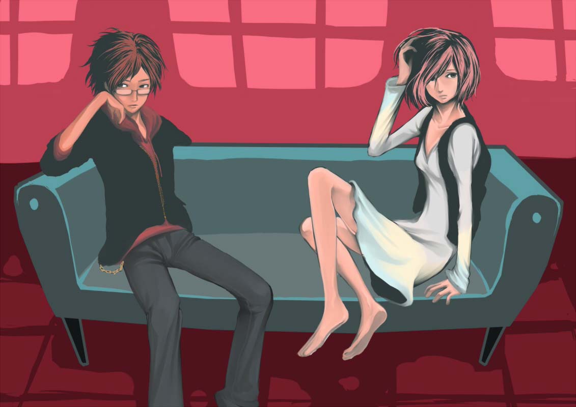 1boy1girlbarefootblack vestblue upholsterycouchdressfeetglasseshair over one eyepink hairshort hairsittingvestwallet chainwhite dress