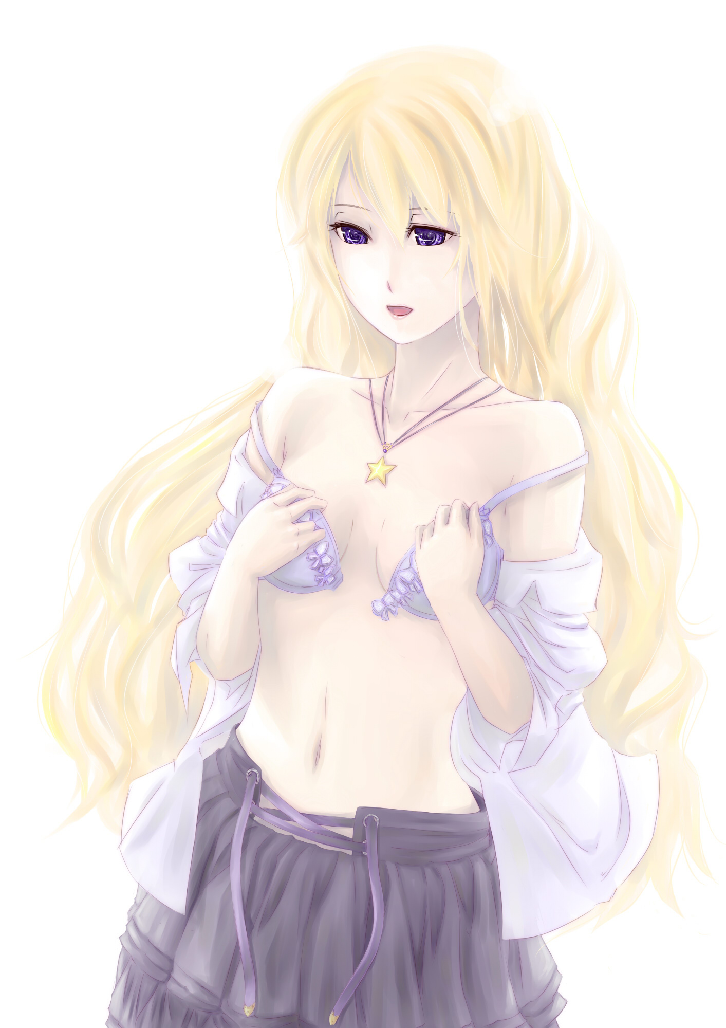 1girlblonde hairblue eyesbrafemale focusfrilled brafrillsjewelrylingerielong hairnavelnecklaceoff shoulderopen braopen clothesopen mouthopen shirtpendantpurple eyesshirtsleeves pushed upsolostrap slipunderwearundressingunfastened