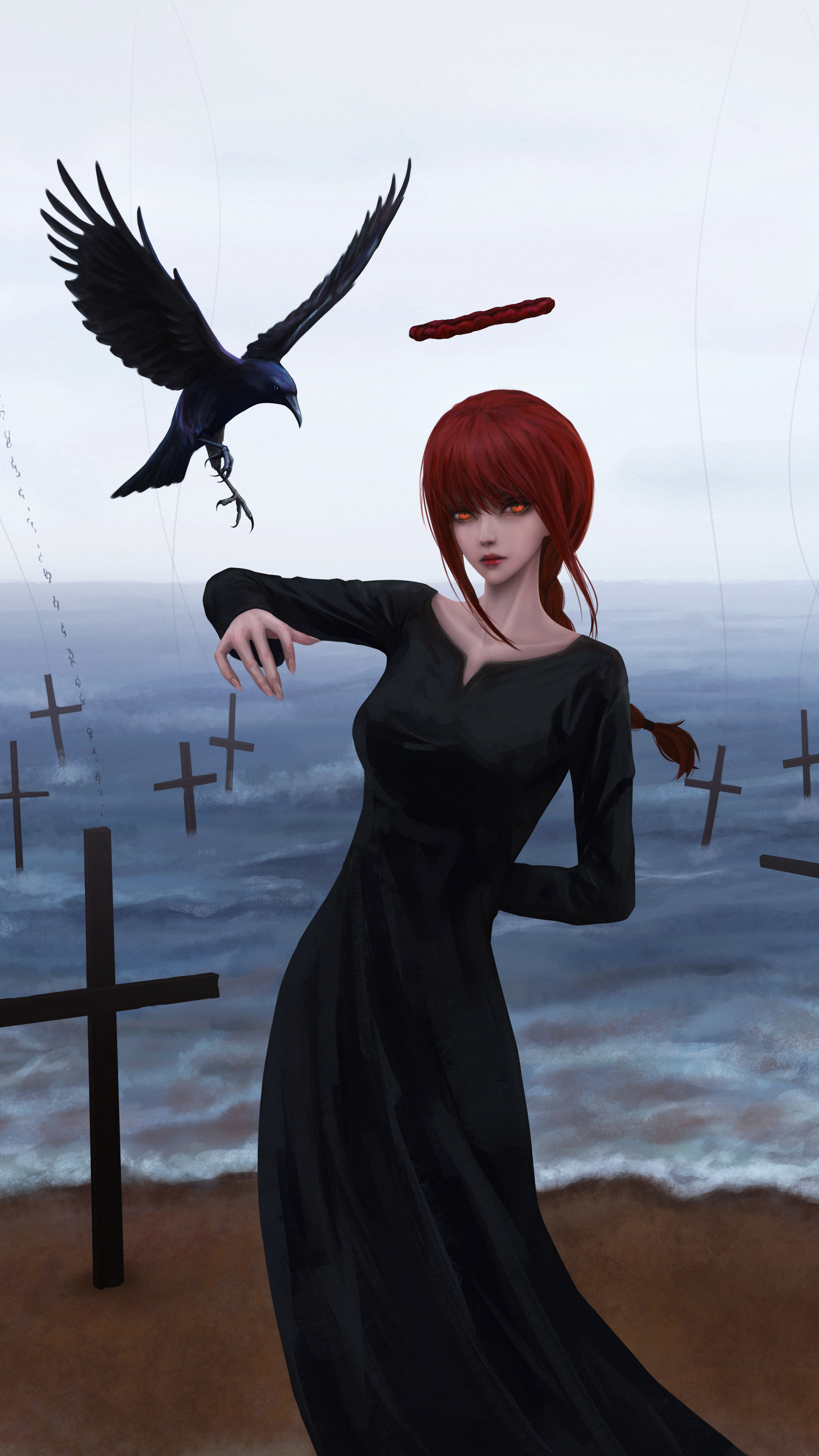1girlarm behind backbeachbirdblack dressbraidbraided ponytailbreastsclosed mouthcrosscrowdresshalolong hairlooking at viewermedium breastsoceanorange eyesoutdoorsovercastred hairred halored lipssandsidelocksskysolostanding
