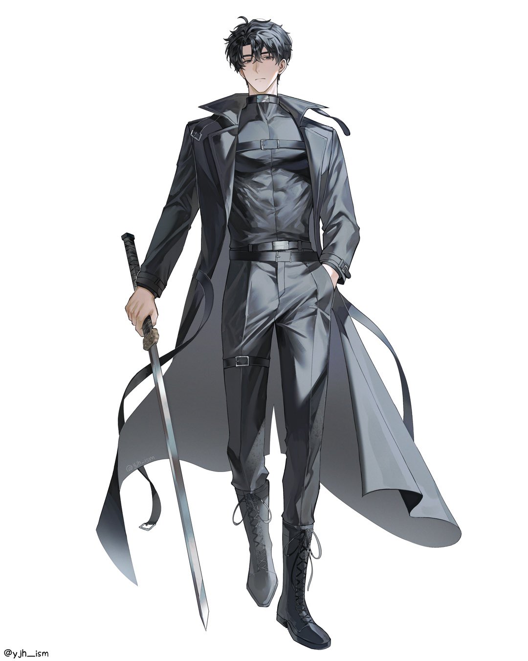 1boyabsblack coatblack eyesblack hairbootscoatcrew neckcurtained hairexpressionlessfull bodyhand in pocketholdingholding swordholding weaponlooking at viewermale focusopen clothesopen coatpopped collarshirtshort hairsoloswordtight clothestight shirtwalkingweaponyjh ism