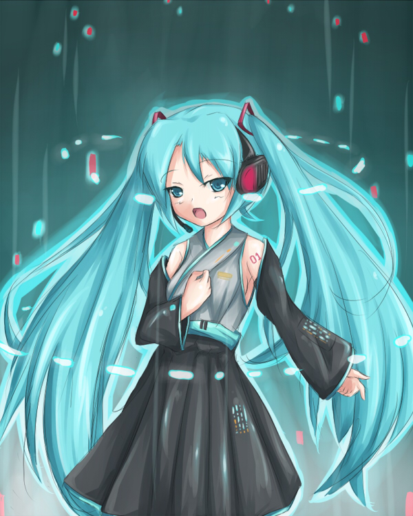 1girlbare shouldersdetached sleevesfemale focusgreen eyesgreen hairheadsetlong hairmatching hair/eyesmusicsingingskirtsolovocoloid