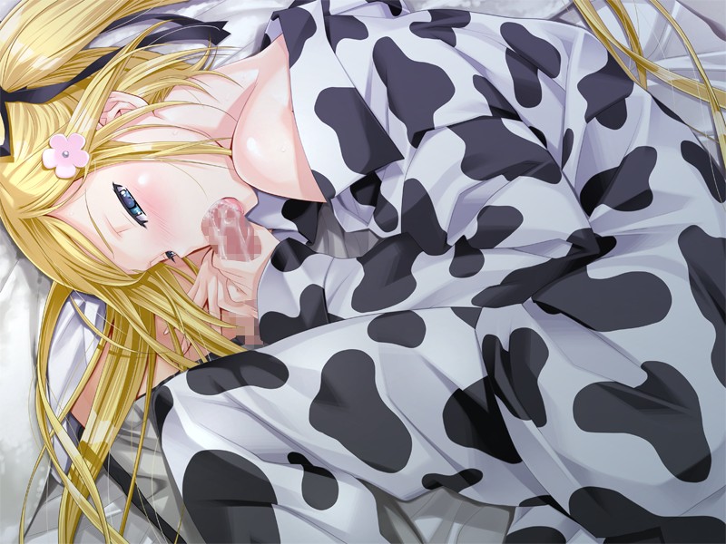 1boy1girlanimal printbare shouldersblonde hairblue eyesblushcensoredcow printcumfellatiohair ornamenthair ribbonhair spread outhairclipheterolong hairlyingmosaic censoringon sideoralpajamaspenisribbontonguetwintails