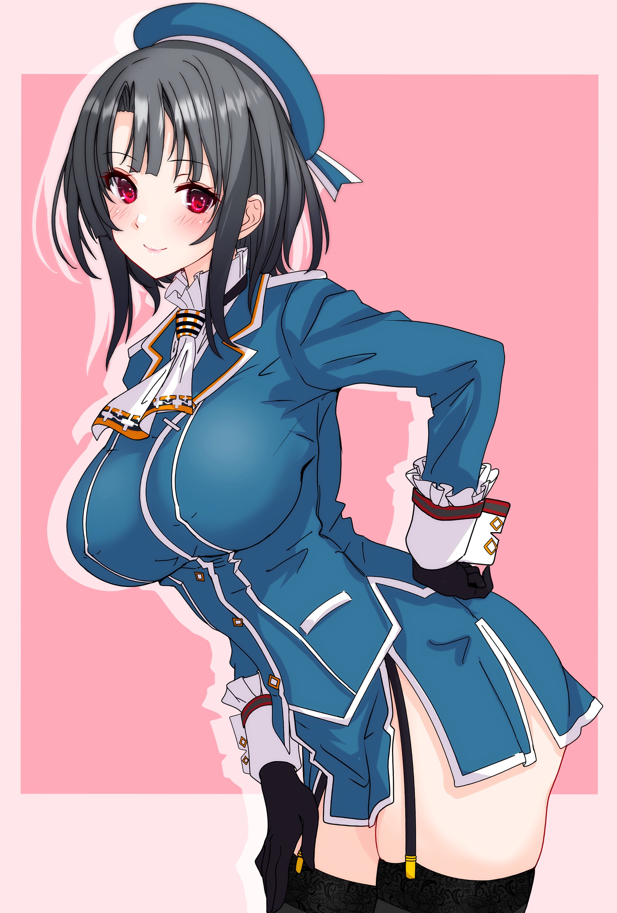 1girlascotberetblack glovesblack hairblack thighhighsblue hatblue jacketblushbreastscowboy shotgarter strapsgloveshatjacketlarge breastslooking at viewermilitarymilitary uniformpink backgroundred eyesshort hairskirtsmilesolothighhighs