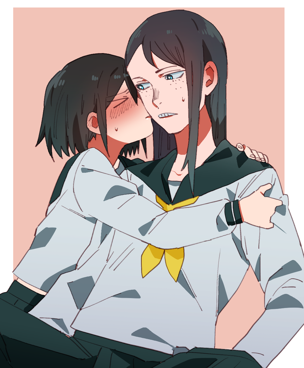 2girlsblack hairblushfreckleslong hairmultiple girlsneckerchiefschool uniformserafukushort hairteethyellow neckerchiefyuri