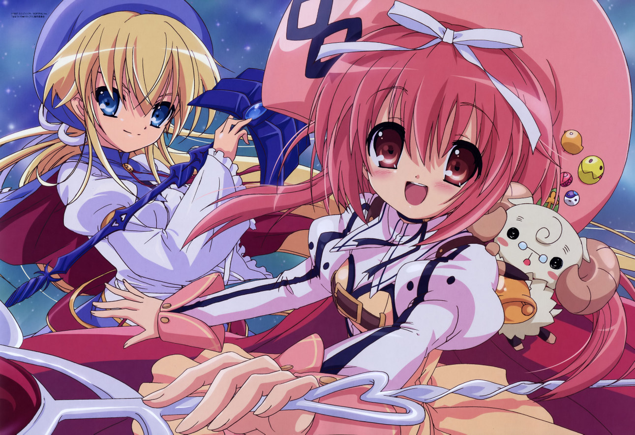 00s2girlsbellblonde hairblue eyesblushdressglasseshatlong hairmultiple girlsnightred eyesred hairribbonskysmilestaffstar (sky)star (symbol)starry sky