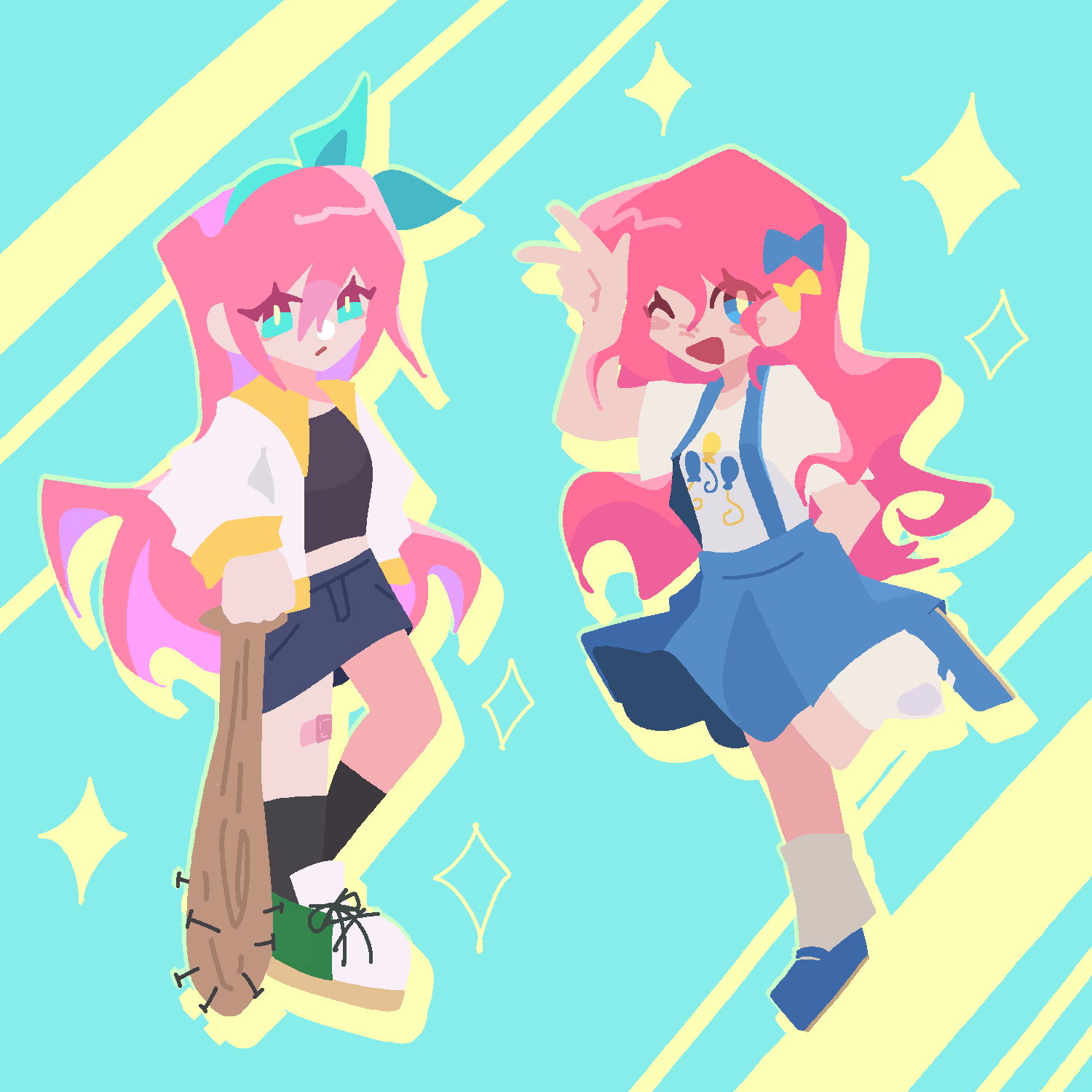 :d2girlsaqua backgroundaqua eyesaqua hairbandarm behind backarm upballoon printbandaidbandaid on kneebandaid on legbaseball batblack shirtblack socksblue bowblue eyesblue shoesblue skirtbowbow hairbandbright pupilsclosed mouthcolor connectioncrop topcropped shirtcrossovercutie markdenimdenim skirtdouble-parted bangsfrownfull bodygreen shoeshair between eyeshair bowhair color connectionhairbandholdingholding baseball batjacketkneehighsknees apart feet togetherknees together feet apartlong hairlong sleevesmary janesmedium skirtmidriffminiskirtmultiple girlsnail (hardware)nail batno lineartone eye closedopen clothesopen jacketopen mouthpink hairpuffy long sleevespuffy sleevesshirtshoelacesshoesshort sleevesskirtsmilesockssparklestandingstanding on one legsuspender skirtsuspenderst-shirttwo-tone backgroundvery long hairwwavy hairwhite jacketwhite shirtwhite socksyellow backgroundyellow bowyellow pupils