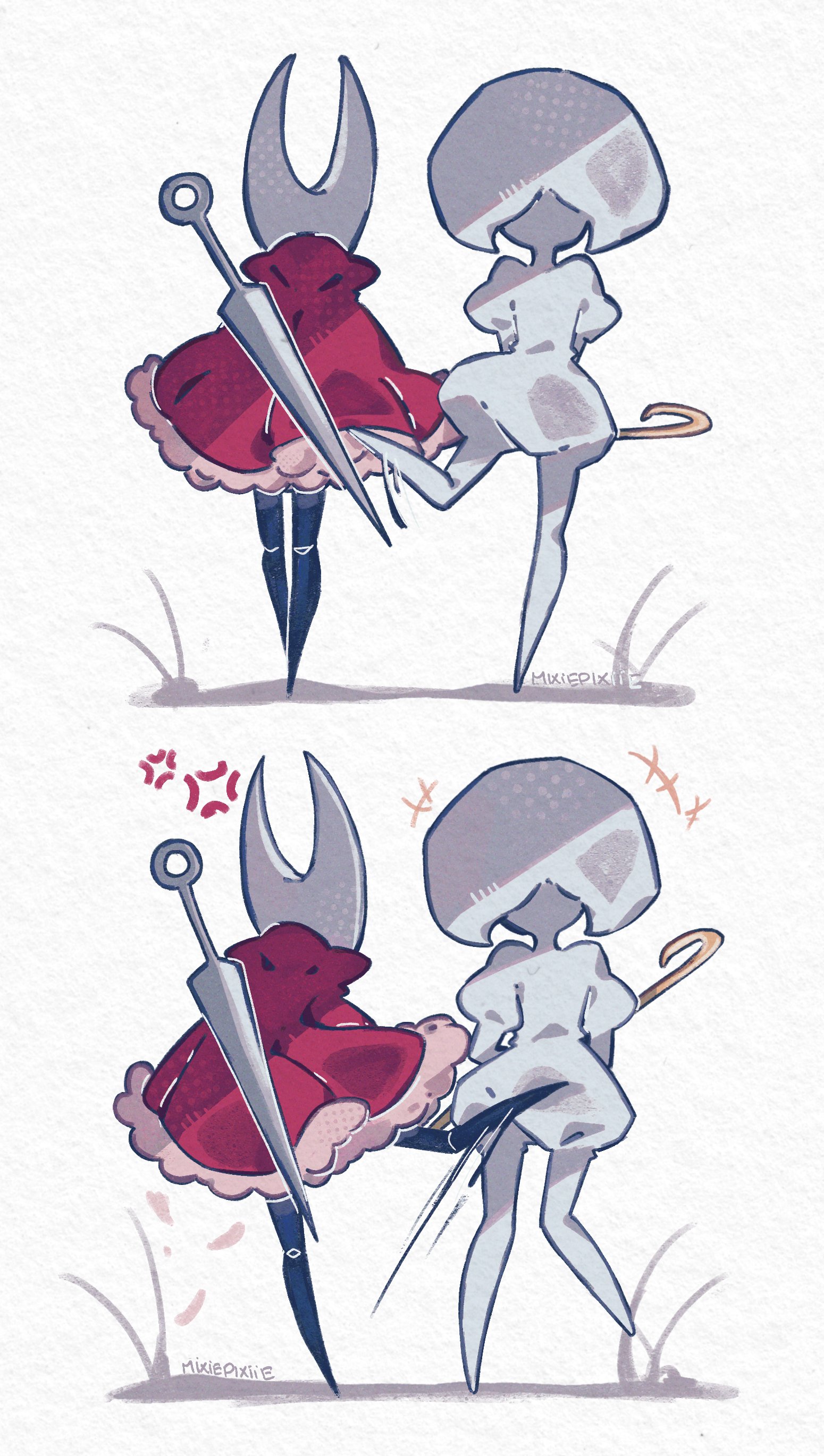 1boy2girlsanger veinangryarthropod girlblack skinchisato and takina kicking each other's butt (meme)cloakcolored skinhorned maskmaskmememultiple girlsneedle (hollow knight)pin (hollow knight)red cloakweaponweapon on backwhite mask