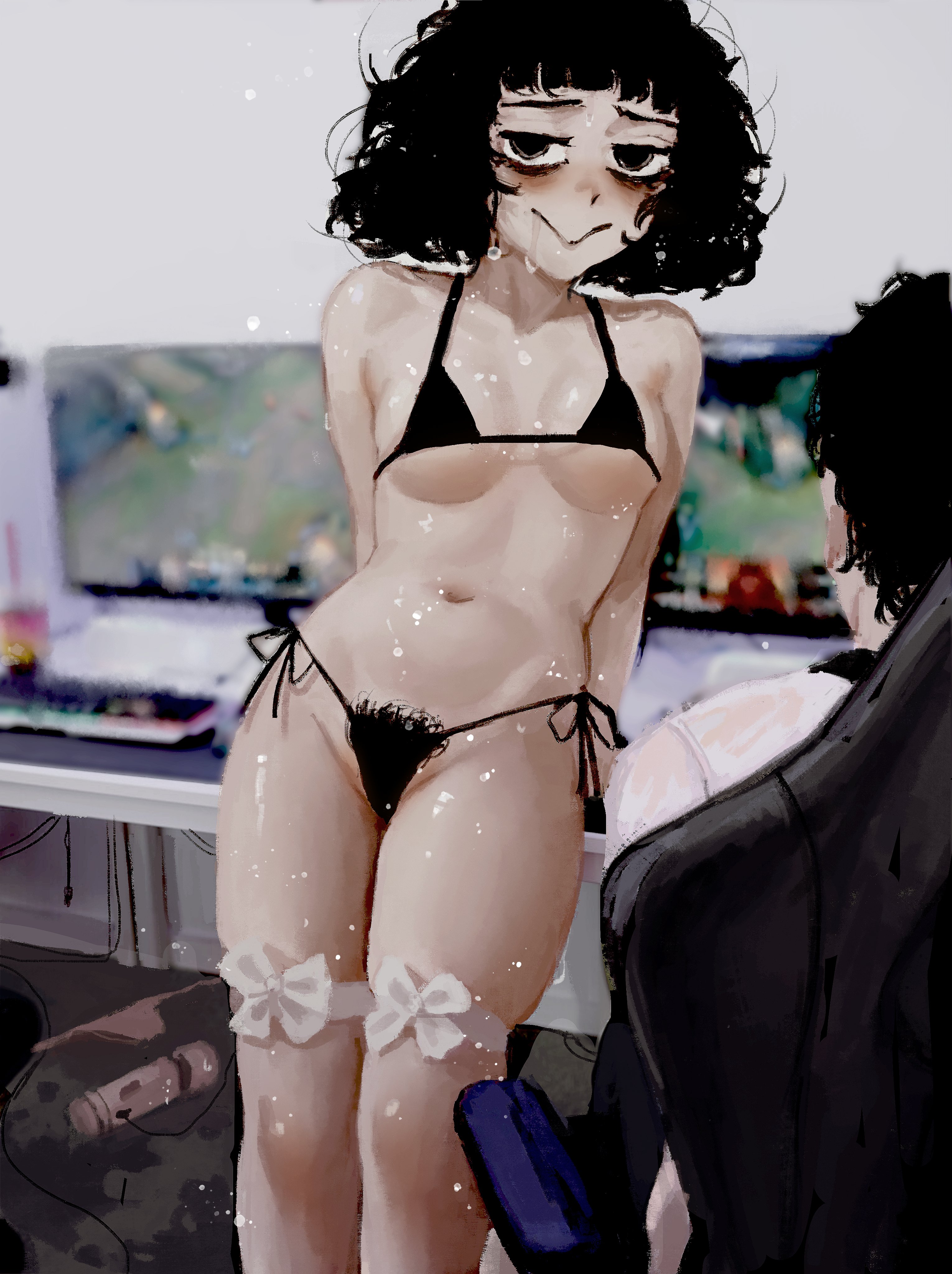 1boy1girlbags under eyesbikiniblack eyesblack hairbreastsempty eyesfemale pubic hairmedium breastsmedium hairmessy hairmicro bikinimojyonavelpubic hairsweatswimsuit