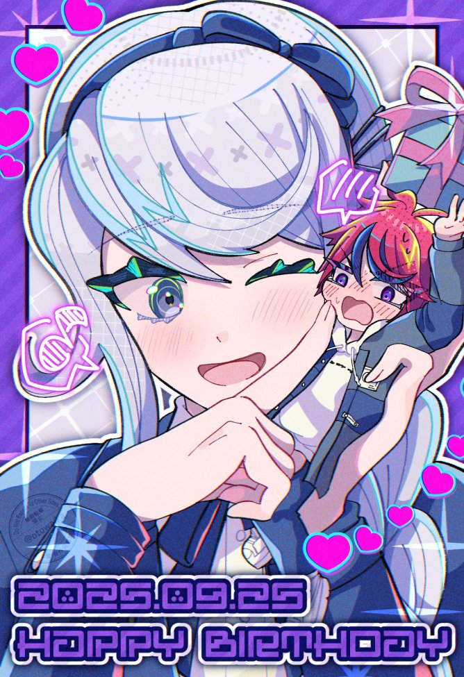 1boy1girlahogeblack hairbandblack jacketblack ribbonblack streaksblue eyesblue jacketblushbraiddatedfull-face blushgiftgrey hairgrey jackethairbandhappy birthdayheartholdingholding giftholding mini personhoodhoodiejacketjacket over hoodielight blushlong hairmini personminiboymulticolored hairmulticolored jacketmusical noteneck ribbonone eye closedopen mouthpurple eyesred hairribbonshirtshort hairsmilespoken blushspoken musical notestreaked hairsweattwo-tone jacketwatermarkwhite hoodiewhite shirt