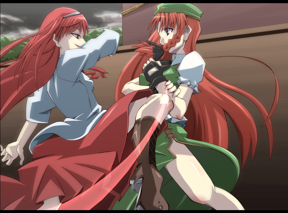 00s2girlsbattlechina dresschinese clothescrossoverdresshatlong hairmotion blurmultiple girlsred hairribbon