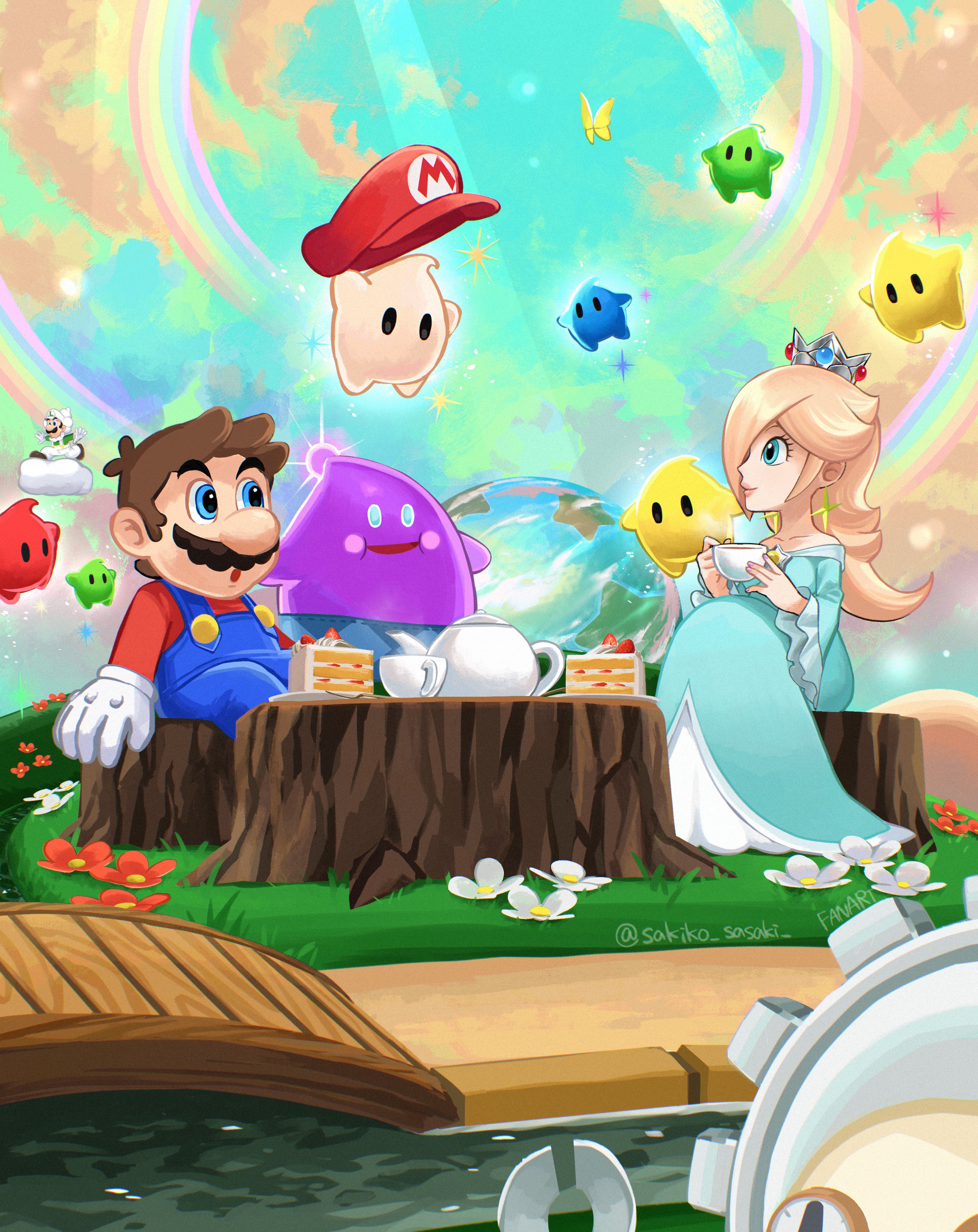 1boy1girlaqua dressartist nameblonde hairblue eyesblue overallsbrown haircakecake slicecrowncupdressearringsfacial hairflowerfoodgloveshair over one eyehatholdingholding cupjewelrylong hairlong sleevesmustacheoverallsred hatred shirtshirtsittingstar (symbol)star earringsteapottree stumpwhite gloves