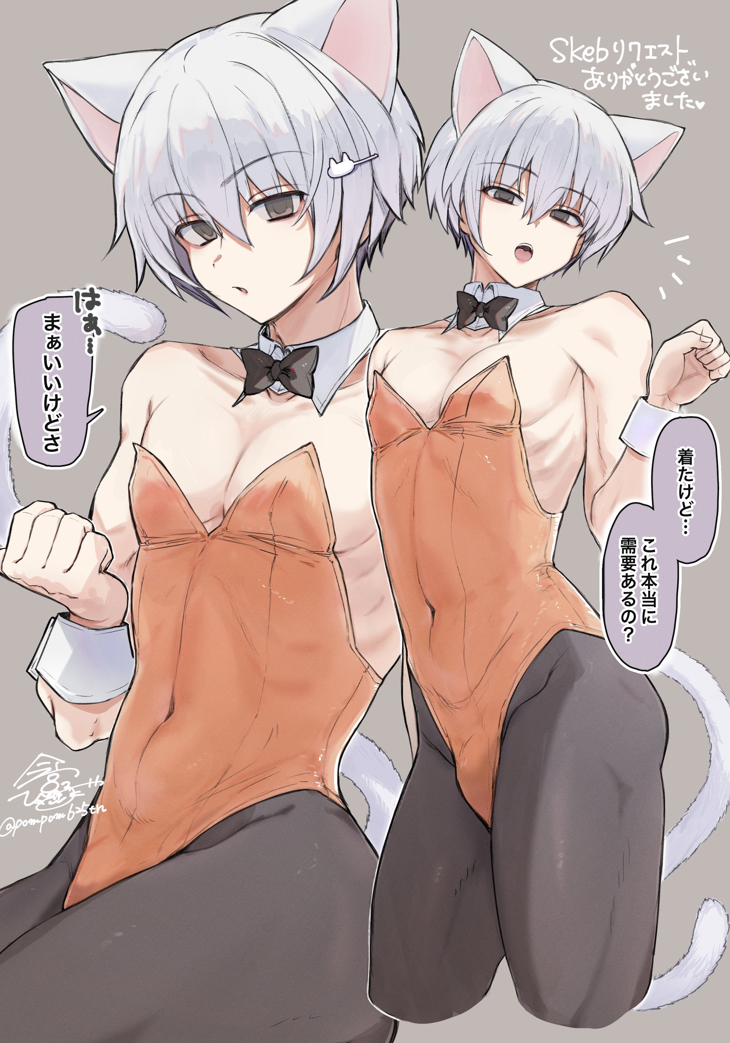 1boybare shouldersblack bowblack bowtieblack pantyhosebowbowtiecat boycat tailclenched handcovered naveldetached collarleotardlooking at vieweropen mouthpantyhosespeech bubblestraplessstrapless leotardtailtrapwhite hairwrist cuffs