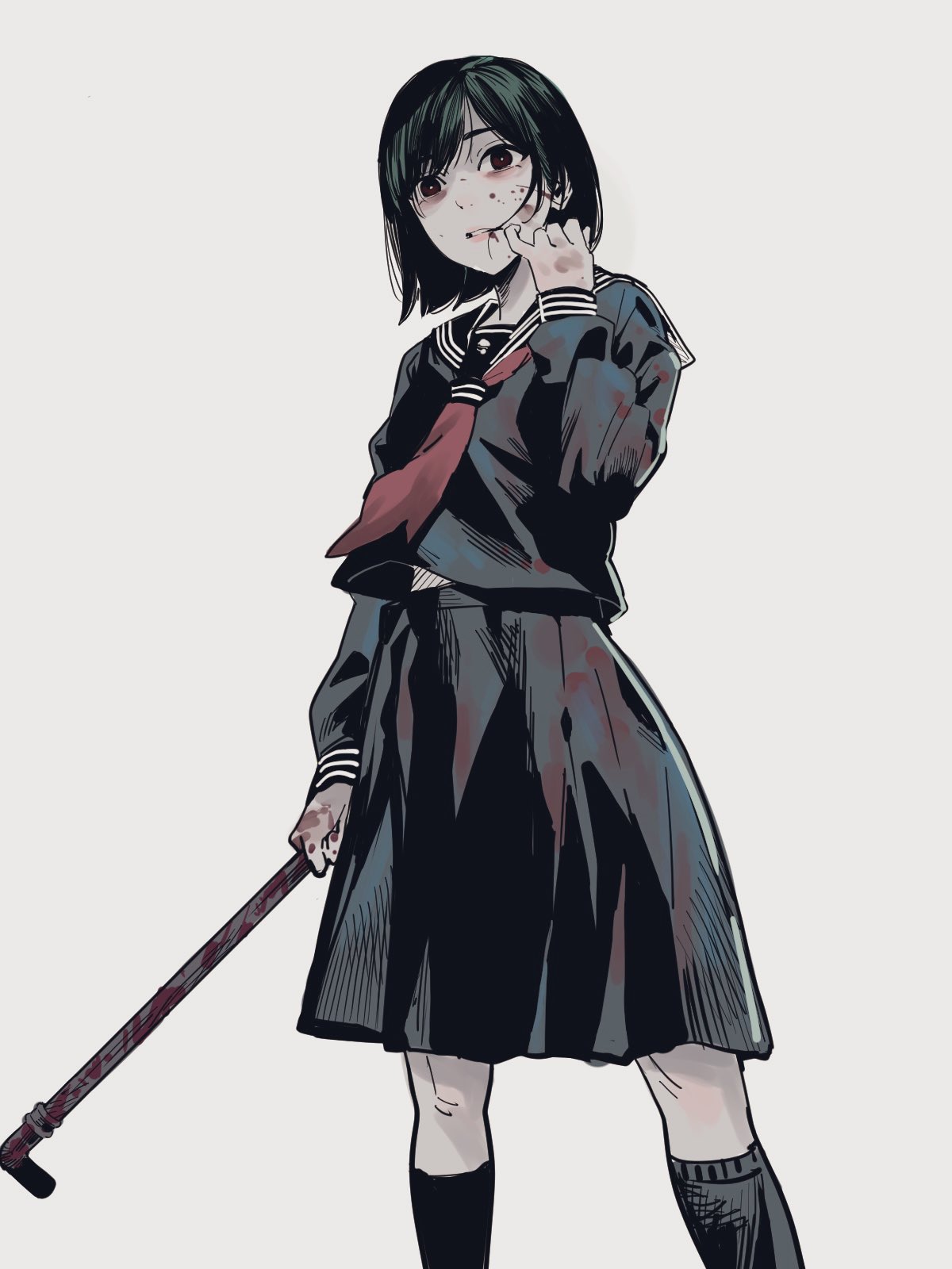 1girlblack hairblack shirtblack skirtblack socksbloodbloody weaponcrowbarhand upholdingholding crowbarkneehighslong skirtlong sleevesparted bangspuffy long sleevespuffy sleevesshirtshort hairsimple backgroundskirtsockssoloweaponwhite background