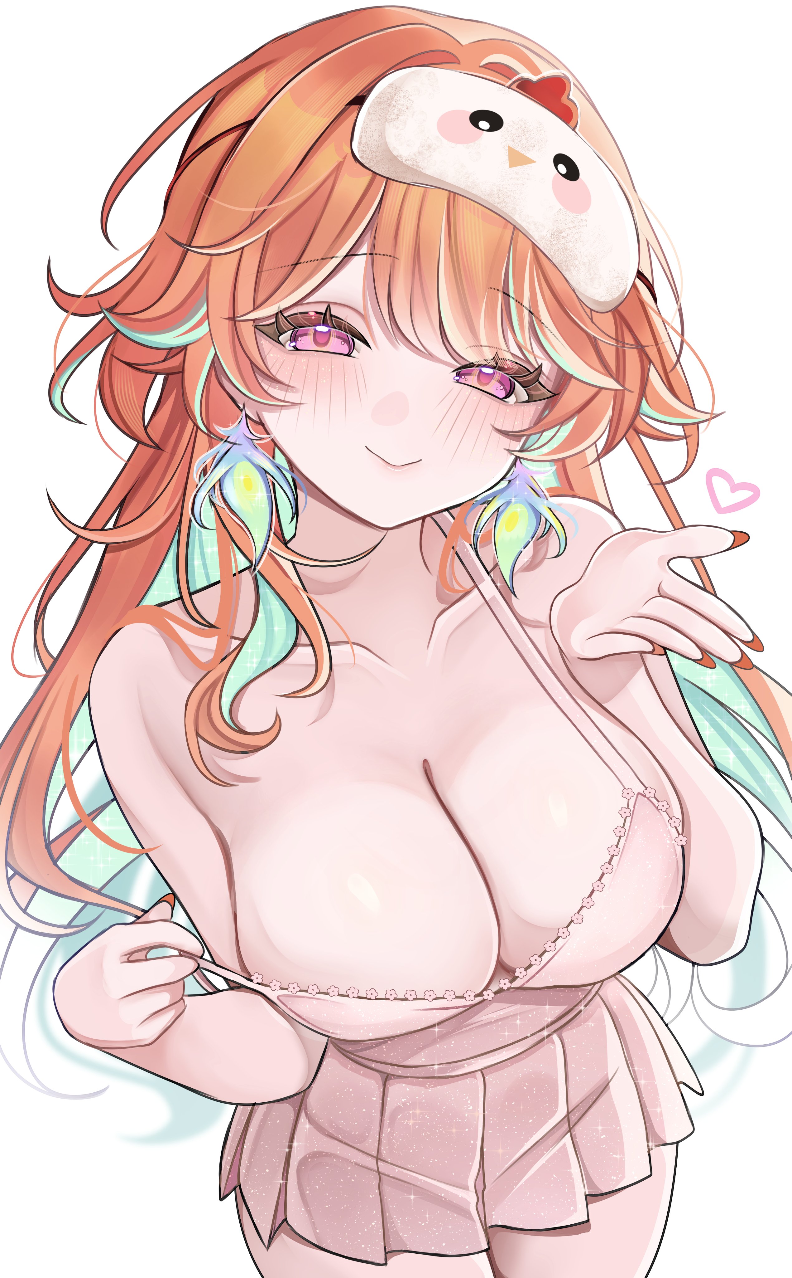 1girlbreastsclosed mouthcolored inner hairearringsfeather earringsfeathersgreen hairhand upjewelrylarge breastslong hairmaskmask on headmulticolored hairnightgownofficial alternate costumeorange hairpink eyespink nightgownsimple backgroundsleep masksmilesolovirtual youtuberwhite background